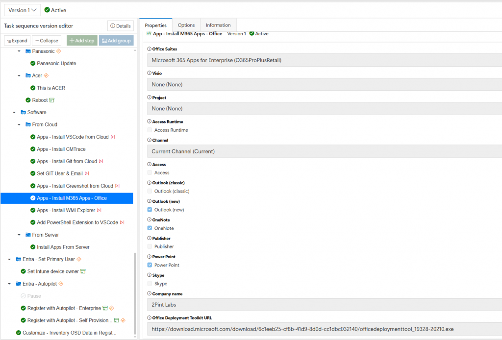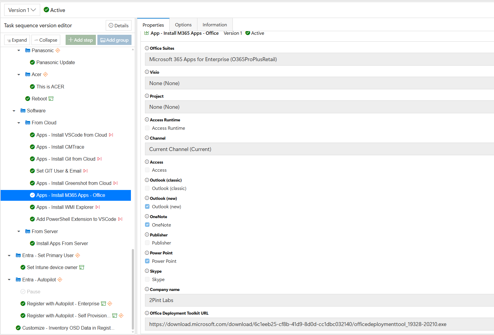 You can see that once this step is imported, you can leverage it to automate the M365 installation by choosing the options you want, the options create variables, and the variables are fed into the script during deployment: