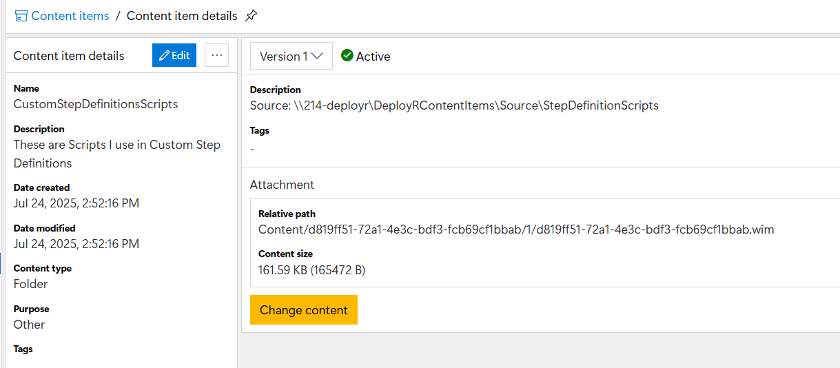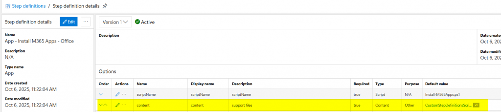 The Install-M365Apps.ps1 script lives inside the DeployR Content item named “CustomStepDefinitionsScripts”, here is the content item as shown in the dashboard, it’s a wim file containing all the scripts I used in my custom steps, which happens to include the Install-M365Apps.ps1 script as well.